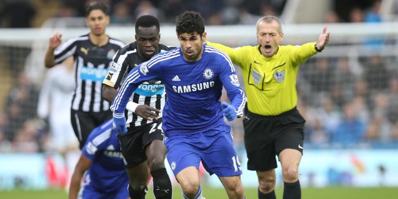 Striker Chelsea, Diego Costa, saat berusaha lolos dari kawalan para pemain Newcastle United pada pertandingan lanjutan Premier League di St James Park, Sabtu (6/12/2014).Peluang emas pertama Newcastle pun tercipta pada menit ke-33. Beruntung bagi Chelsea, kiper Thibaut Courtois dapat dengan sigap menepis bola tendangan Ameobi dari dalam kotak penalti The Blues.
