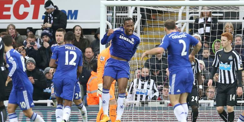 Striker Chelsea, Didier Drogba, saat merayakan golnya ke gawang Newcastle United pada laga lanjutan Premier Laegue di Stadion St James Park, Sabtu (6/12/2014).Menurut catatan ESPN, sepanjang pertandingan, Chelsea menguasai bola sebanyak 66 persen dan menciptakan delapan peluang emas dari 26 usaha. Adapun tim tuan rumah melepaskan tiga tembakan akurat dari sembilan percobaan.